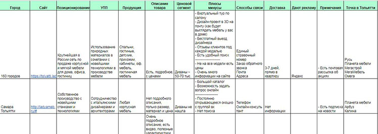 Отдельный блок при создании площадки в соцсети — анализ конкурентов. Мы определили несколько критериев для проведения оценки: города, где представлена продукция, позиционирование, УТП (уникальное торговое предложение), продукция, описание товара, ценовой сегмент, плюсы/минусы, способы связи, доставка, наличие рекламы, наличие точки в городе.В итоге такой подробный анализ позволил нам выяснить, что у большинства компаний нет УТП, они все очень похожи, поэтому мы принялись разрабатывать своё.