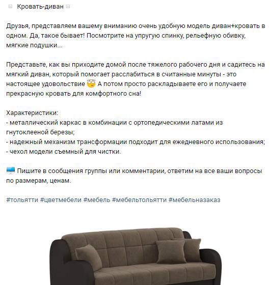 Определили оптимальное количество постов: два в день. Виды контента разбили на две части: продающий и полезный/развлекательный. То есть один пост был посвящен какой-нибудь мебели, второй — полезному совету по уходу за мебелью или красивый пример интерьера квартиры.Также отдельно можно выделить вид постов, которые вовлекают пользователей, напоминают им о вашей компании и помогают повысить лояльность.Выглядело это так: пользователи любят внимание и когда у них интересуются, что им нравится и что бы они выбрали. Им нравится сравнивать свои ответы с ответами других пользователей. Поэтому мы проводим опросы. Вовлечённость повышают посты-конкурсы, посты-игры, опросы. Примеры нашего постинга: